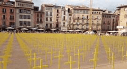 La plaza Mayor de Vich sembrada de cruces amarillas en sentido homenaje a las víctimas de la atroz represión policial durante el “Proceso”. Ni Sarajevo.
