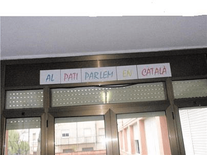 Consigna lingüística en una escuela catalana (concertada). Municipio: Cornellá de Llobregat. Al amparo de la Ley Celaá, ANC (Viggo Tontensen, quise decir Mortensen) y Òdium Cultural han exigido que en el patio se imponga el catalán como lengua relacional obligatoria entre los niños, dejando de ser una mera «recomendación».